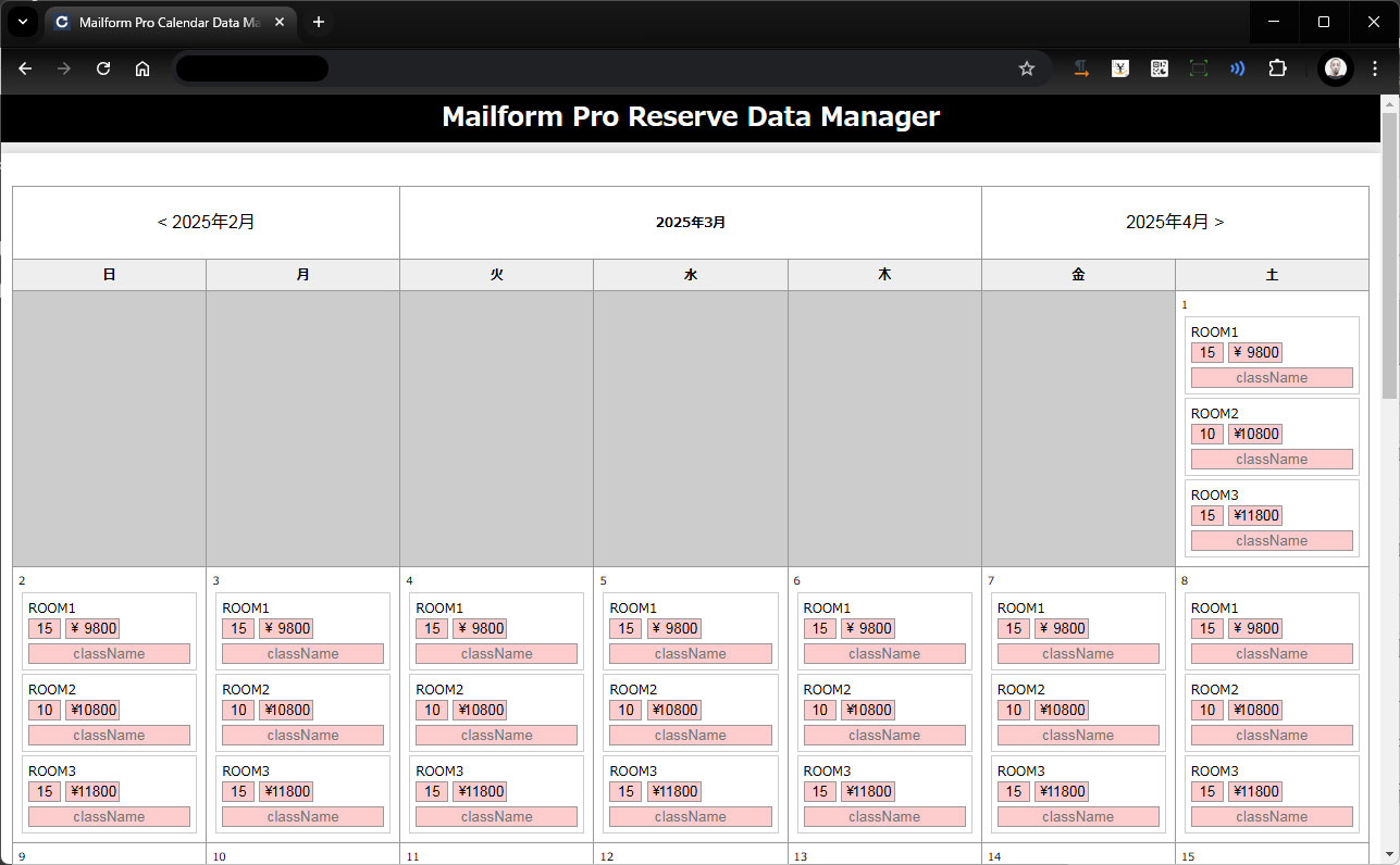 こういう感じの管理機能から生成されます。日付毎に価格・在庫・クラス名を指定することが可能!すごく柔軟です!そして複数の予約カレンダーを管理することができます。