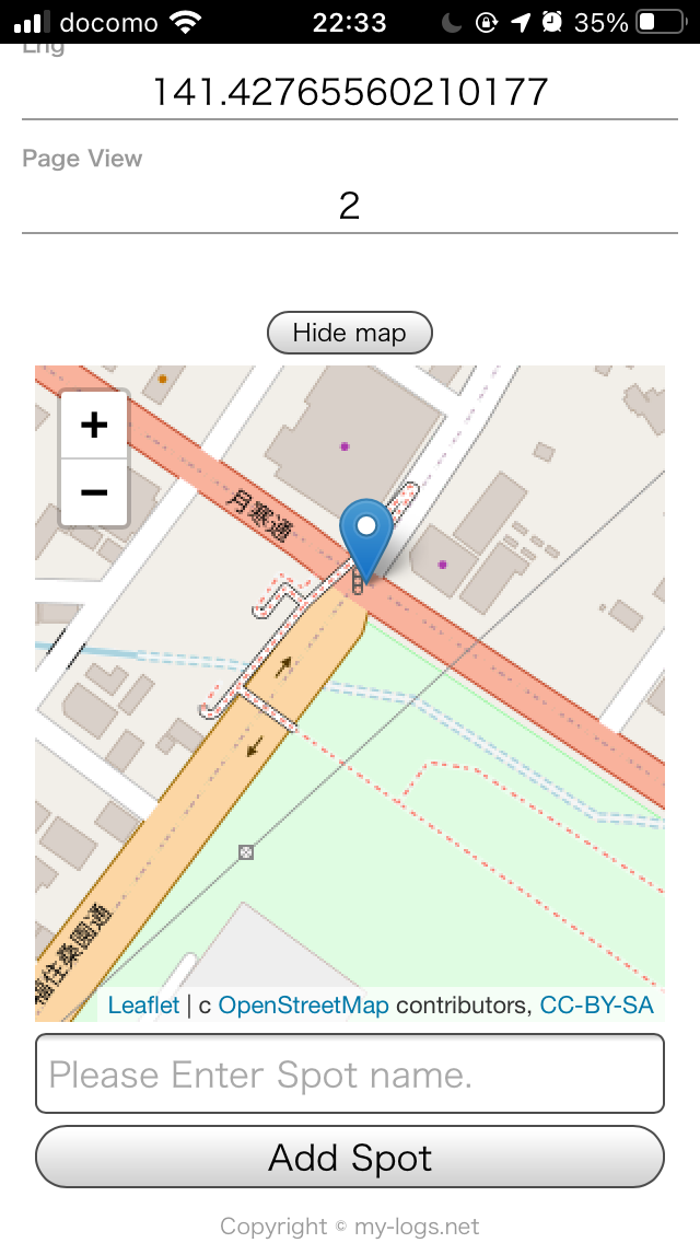 Show mapをタップして地図を表示させ、その地図をタップするとタップした場所にピンを刺せます。Add spotでピンを追加していくと地図上にルートマップを作成することができます。