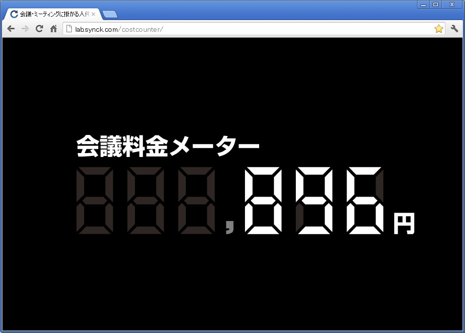 タクシーの料金メーターのように会議・打ち合わせに掛かる人件費を人数と時間から産出する会議・打ち合わせ・ミーティング料金メーターです。iPhoneにも対応。これを会議中に動かして無駄な時間を削減しよう!