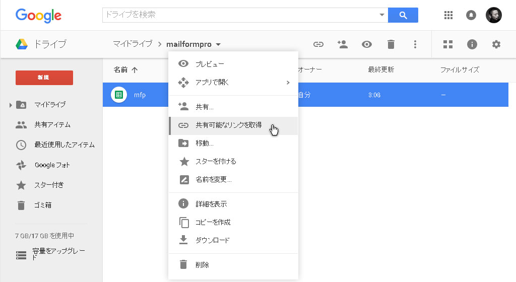 6.Googleドライブに戻り、作成したスプレッドシートmfpを右クリックすると表示される共有可能なリンクを取得をクリック。