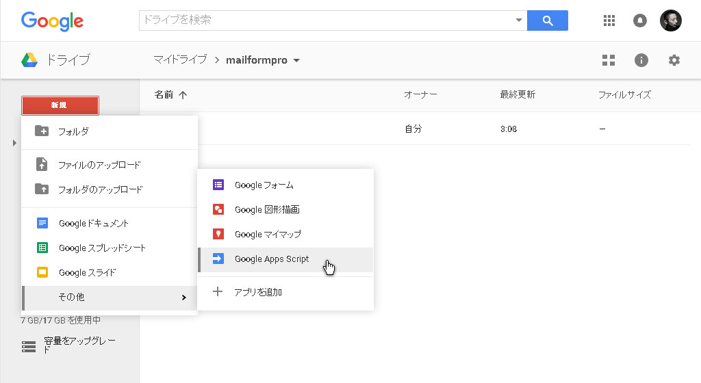 7.新規をクリックして[その他]→[Google Apps Script]を作成します。