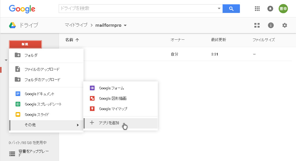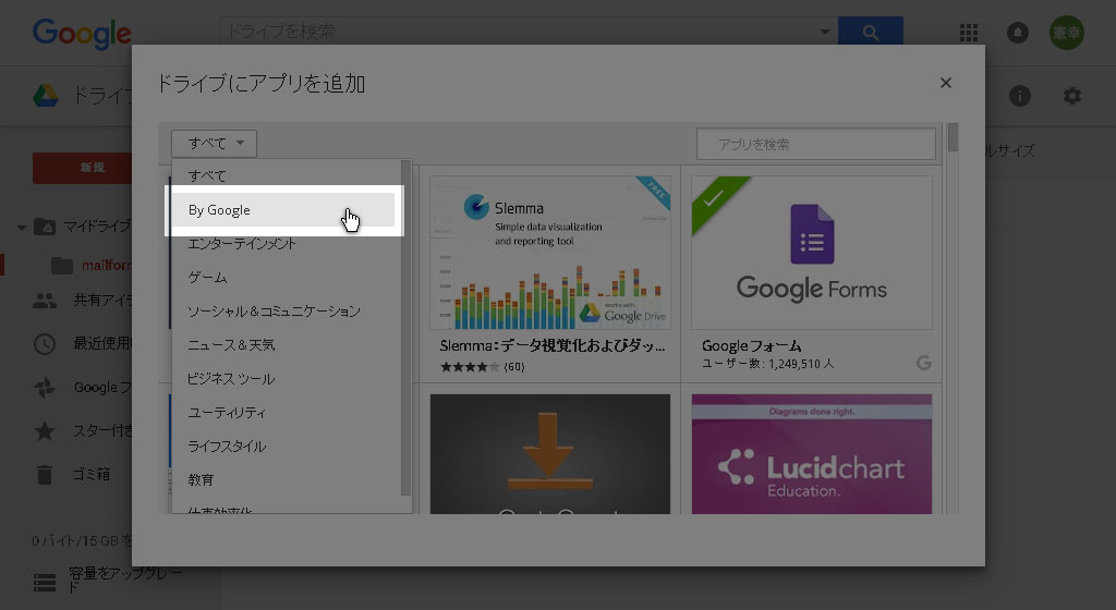 [新規]→[その他]→[アプリを追加]をクリックし、左上のセレクトからby Googleを選択してください。