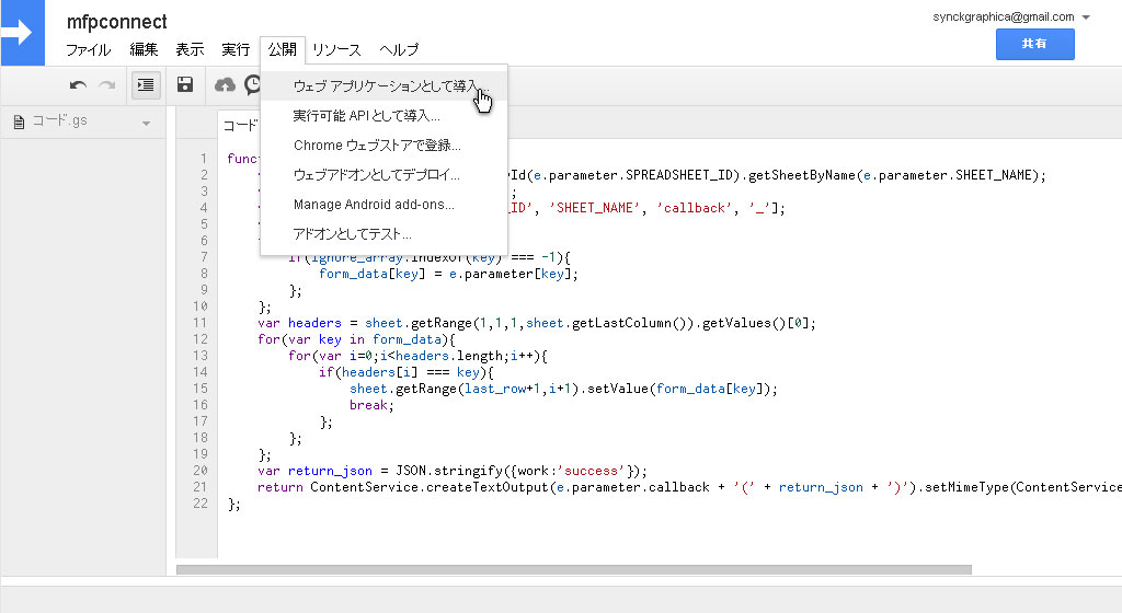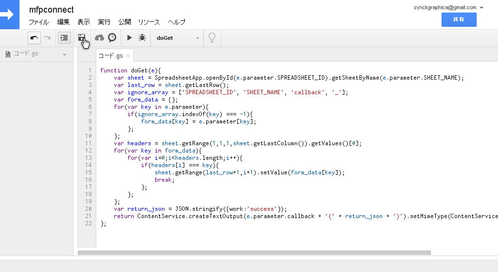 8.同梱されている/examples/code.gs.txtの中身のコードをコピー&ペーストし、保存します。