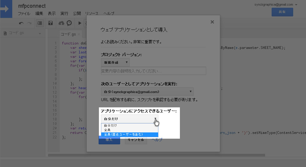 アプリケーションにアクセスできるユーザーを全員(匿名ユーザーを含む)に設定し導入をクリック。