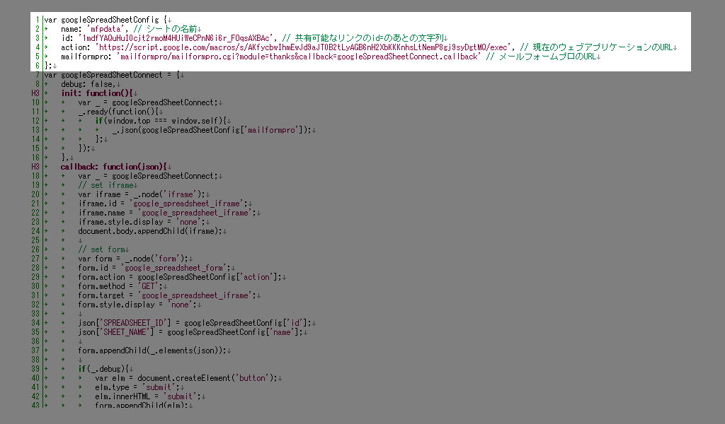 の3つがあります。こちらを同梱されている/mfp.statics/google.spreadsheet.connect.jsの最初の方にある部分に設定します。